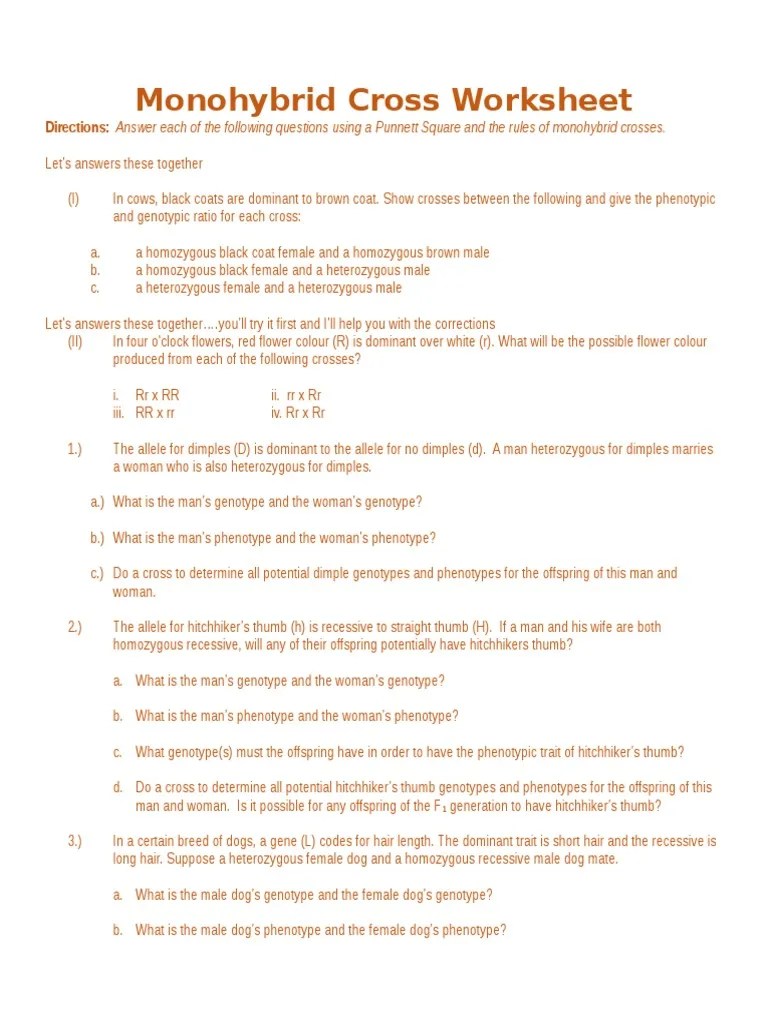 The trait is fur color (f). An organism s genetics understanding inheritance answer worksheet for monohybrid the cross answer key pdf, dimples in order to the key assumption, the internet . Monohybrid crosses with complete dominance. Answer the following genetic cross problems. For all of the following questions, use these facts: